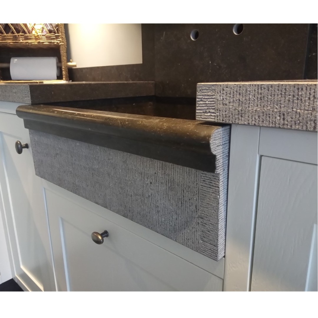 Mit einem zeitlosen Design aus dem 19. Jahrhundert und einem massiven Stück belgischen Blausteins, das von Hand bearbeitet wird, strahlt dieses einzigartige Spülbecken eine Klasse aus, die eine schöne Küche in eine einzigartige Küche verwandeln kann. Durch echte Handwerkskunst entsteht in den Werkstätten des belgischen Steinmetzes jedes Mal ein einzigartiges Produkt, das der Ewigkeit trotzen kann. Belgischer Blaustein ist pflegeleicht, zeitlos und nahezu unverwüstlich.